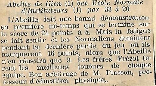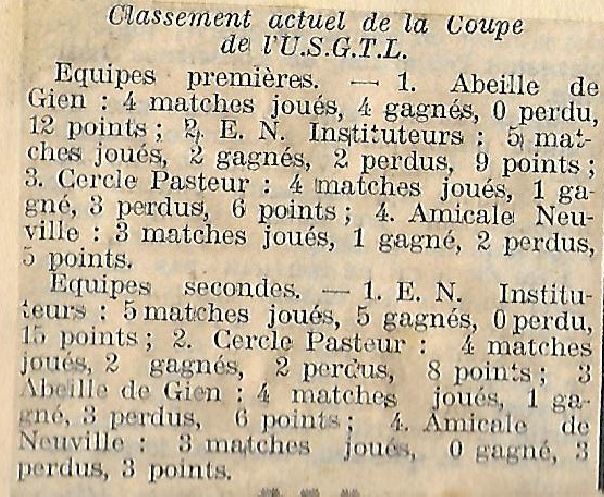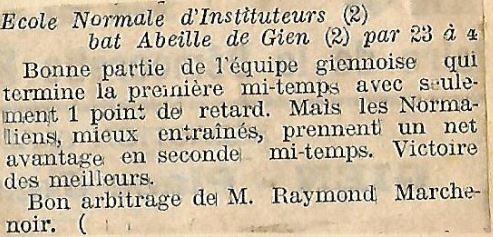 En Coupe de l’U.S.G.T.L. l’Abeille de Gien (1) rencontre l’Ecole Normale d’Instituteurs d’Orléans (1)