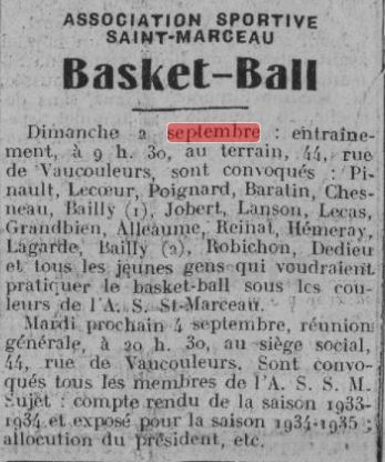Saison 1934-1935 : Association Sportive de Saint-Marceau – « Convocation pour le Dimanche 2 Septembre 1934 »