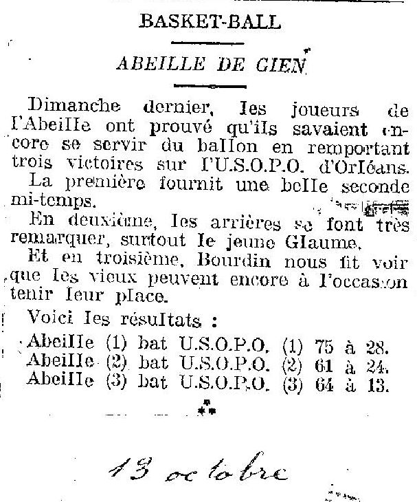 Saison 1935-1936 : Résultats des Matches Abeille de Gien – U.S.O.P.O. Orléans