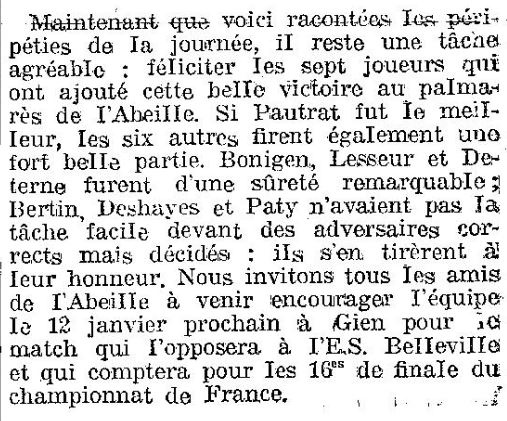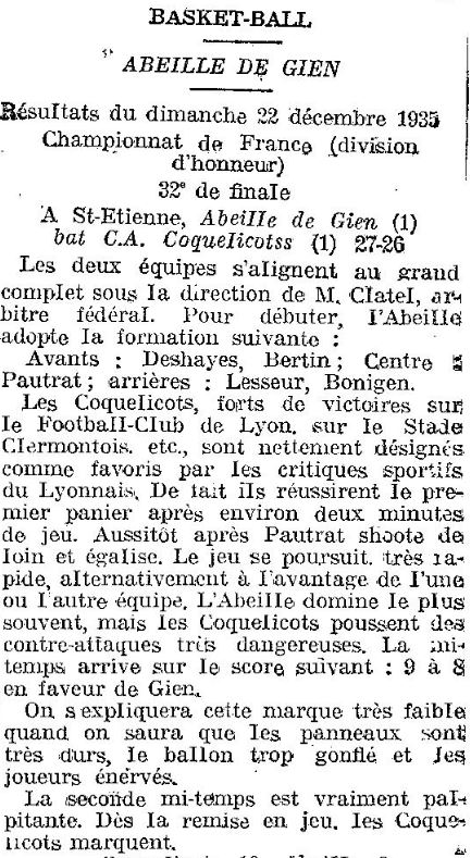 Saison 1935-1936 : En 32ème de Finale du Championnat de France Honneur, l’Abeille de Gien (1) se qualifie aux dépends de l’AS Coquelicots (1)