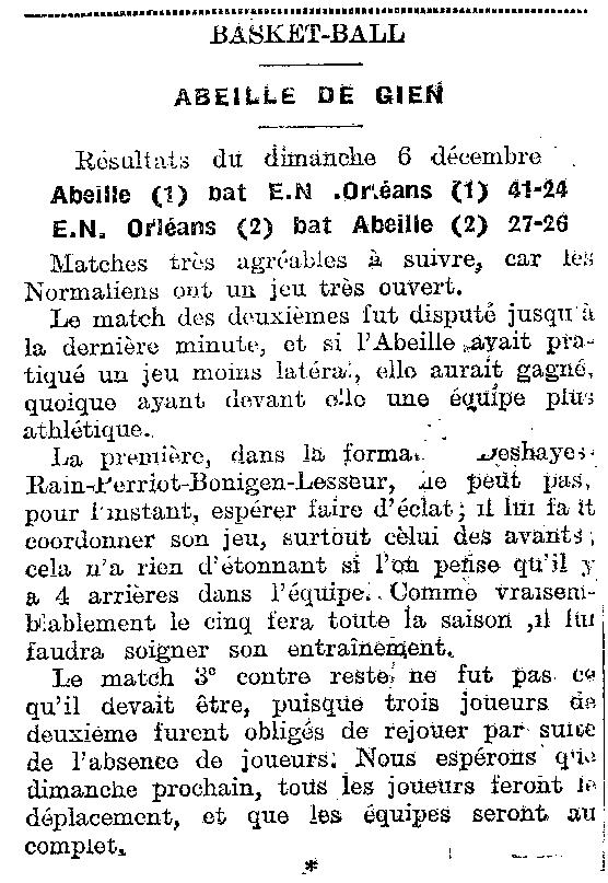 Saison 1936-1937 : Résultats des Matches Abeille de Gien (1) et (2) contre Ecole Normale Orléans (1) et (2)