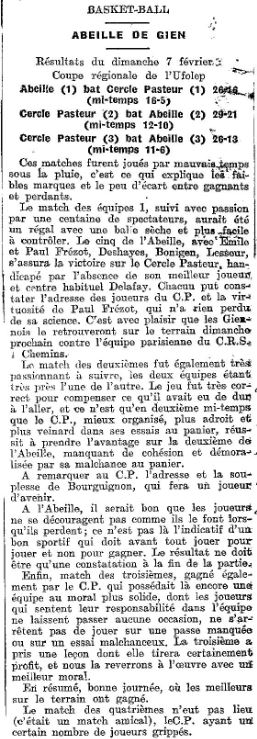 Saison 1936-1937 : Résultats des Matches Abeille de Gien (1,2 et3) contre Cercle Pasteur de Montargis (1, 2 et 3)
