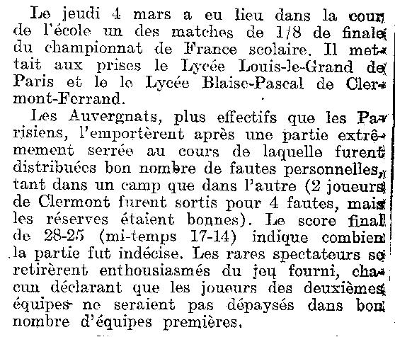 Saison 1936-1937 : Résultat du Match Lycée Louis le Grand Paris contre Lycée Blaise Pascal de Clermont-Ferrand