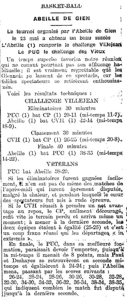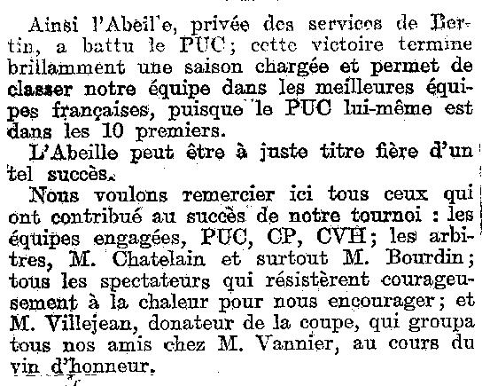 Saison 1936-1937 : En battant le P.U.C. l’Abeille remporte le Challenge Villejean