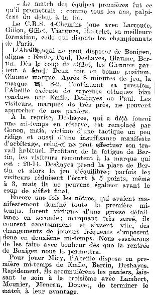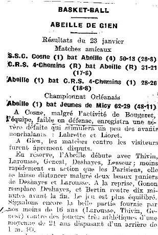 Saison 1937-1938 : Résultats des Matches Amicaux de l’Abeille de Gien et du Championnat de l’Orléanais Abeille de Gien (1) contre Jeunes de Micy