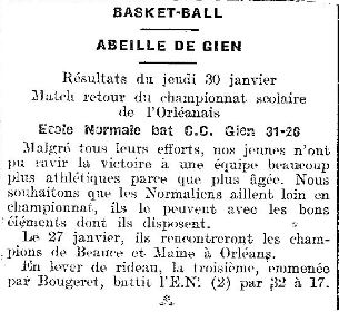 Saison 1937-1938 : Résultat du Match du Championnat Scolaire de l’Orléanais, Ecole Normale contre C.C Gien