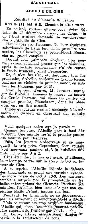 Saison 1937-1938 : Résultat du Match Abeille de Gien (1) contre AS Cheminots Etat
