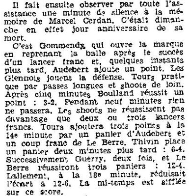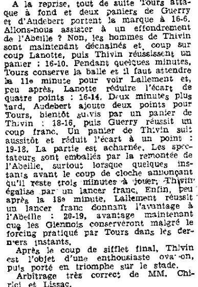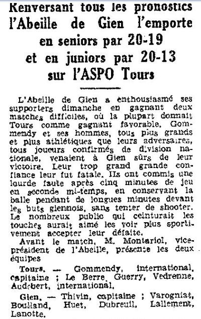 Saison 1950-1951 : L’Abeille de Gien bat l’ASPO Tours en Seniors et en Juniors