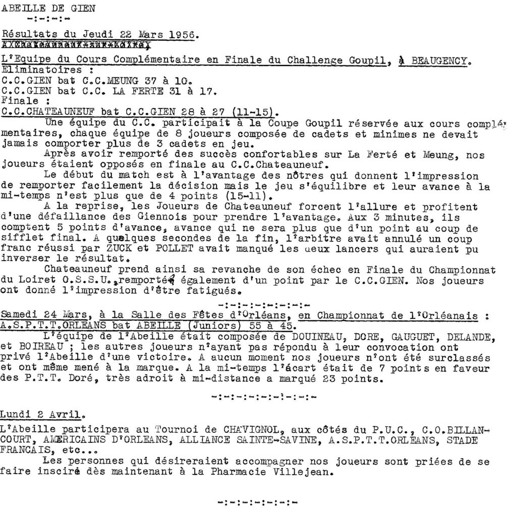 Saison 1955-1956 : Résultats des Journées du 22 et 24 Mars 1956 pour les équipes de l’Abeille de Gien