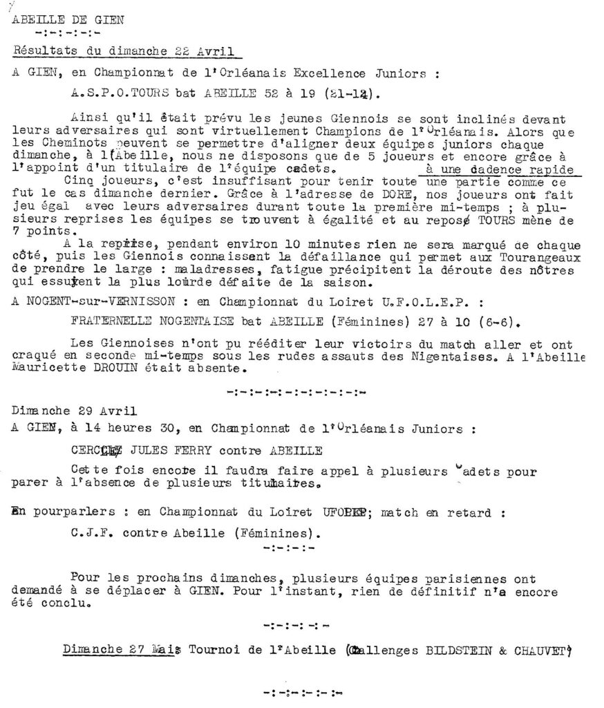 Saison 1955-1956 : Résultats de la Journée du 22 Avril 1956 pour les équipes de l’Abeille de Gien