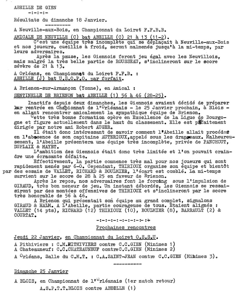 Saison 1958-1959 : Résultats des Journées des 22 et 25 Janvier 1959 des équipes de l’Abeille de Gien »