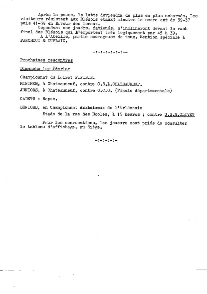 Saison 1958-1959 : Résultats des Journées des 22 et 25 Janvier 1959 des équipes de l’Abeille de Gien