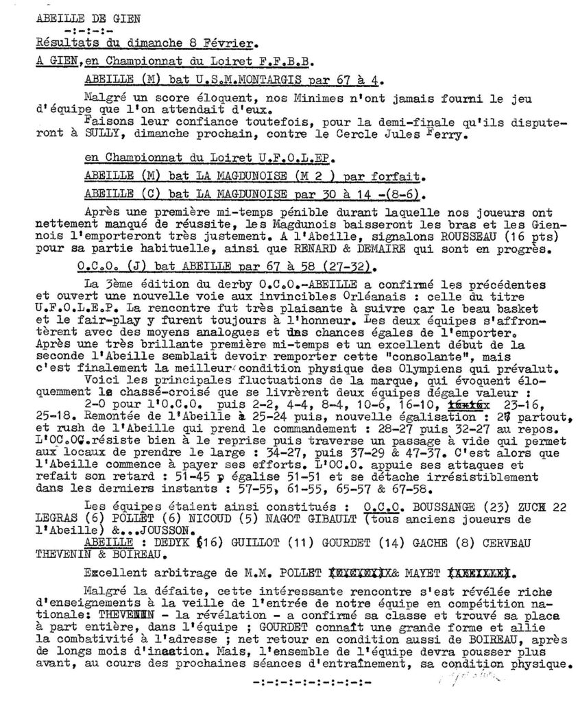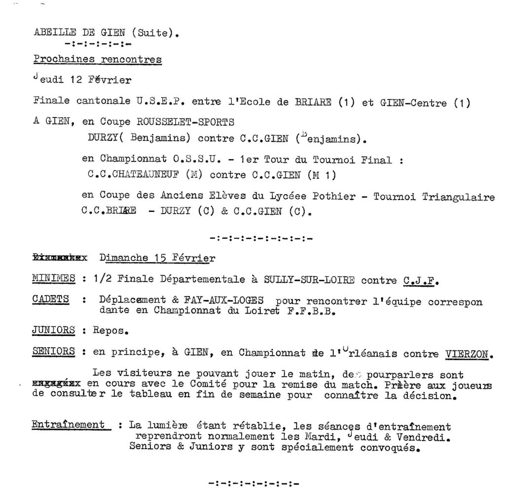 Saison 1958-1959 : Résultats de la Journée du 8 Février 1959 pour les équipes de l’Abeille de Gien