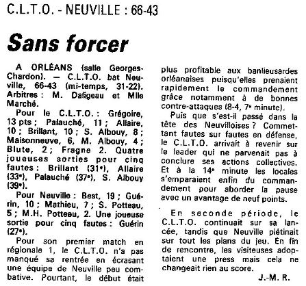 Saison 1986-1987 : Lors de la Journée du 5 Octobre 1986, en Championnat de Régionale Féminine 1, le CLTO bat Neuville
