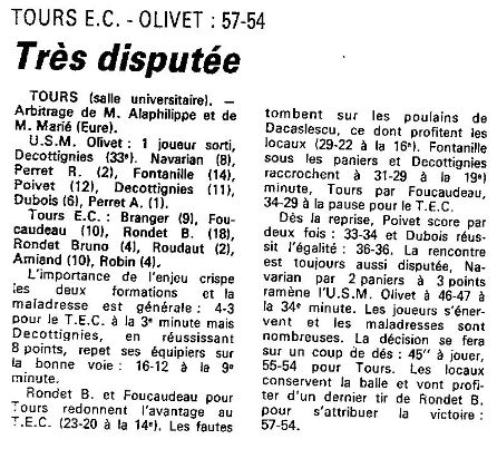Saison 1986-1987 : Lors de la Journée du 12 Octobre 1986, en Championnat de Régionale Masculine 1, le Tours EC bat Olivet