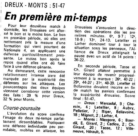 Saison 1986-1987 : Lors de la Journée du 19 Janvier 1986, en Championnat de Régionale Féminine 1, Dreux bat Monts