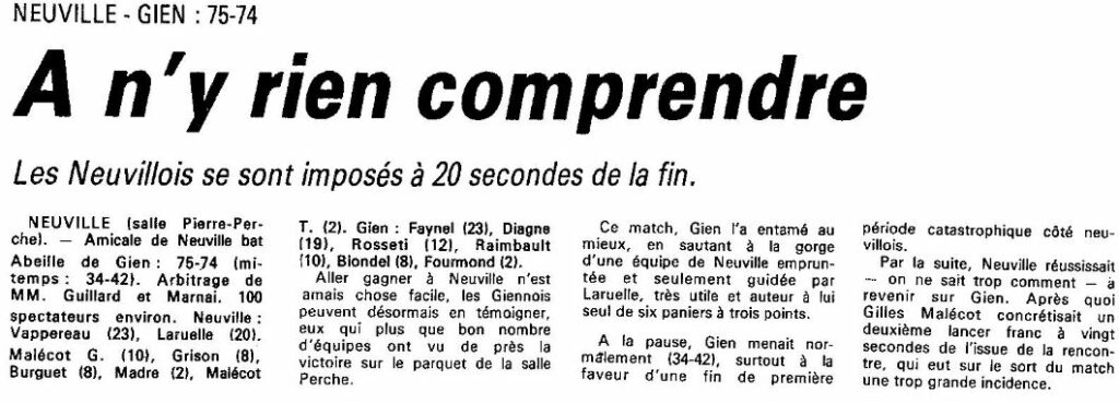 Saison 1986-1987 : Lors de la Journée du 26 Octobre 1986, en Championnat de Régionale Masculine 1, Neuville bat l’Abeille de Gien
