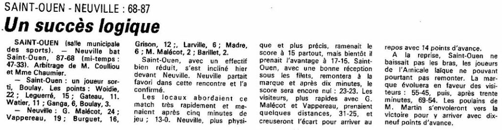 Saison 1986-1987 : Lors de la Journée du 2 Novembre 1986, en Championnat de Régionale Masculine 1, Neuville bat Saint-Ouen