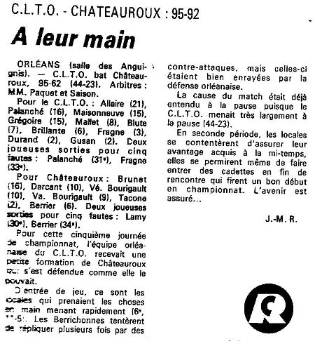 Saison 1986-1987 : Lors de la Journée du 9 Novembre 1986, en Championnat de Régionale Féminine 1, le CLTO bat Châteauroux