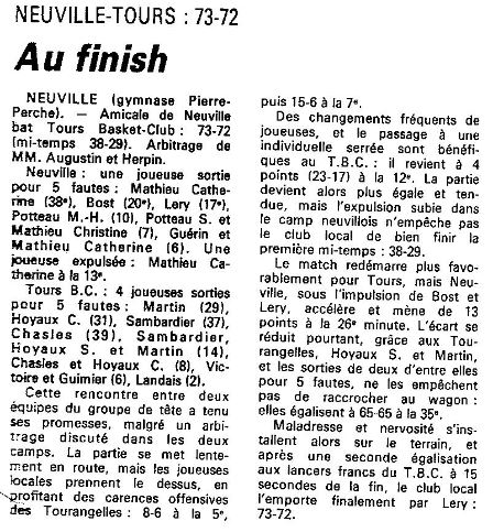 Saison 1986-1987 : Lors de la Journée du 9 Novembre 1986, en Championnat de Régionale Féminine 1, Neuville bat Tours BC