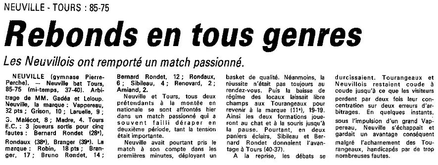 Saison 1986-1987 : Lors de la Journée du 16 Novembre 1986, en Championnat de Régionale Masculine 1, Neuville bat Tours EC