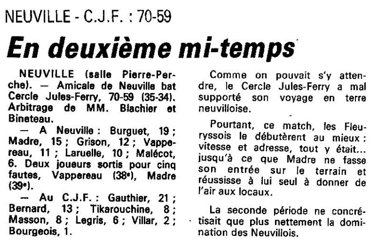 Saison 1986-1987 : Lors de la Journée du 23 Novembre 1986, en Championnat de Régionale Masculine 1, Neuville bat le CJF