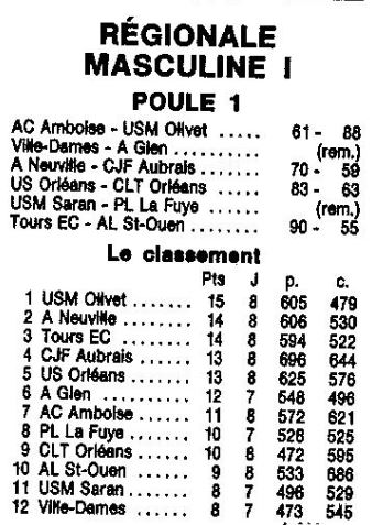 Saison 1986-1987 : Résultats et Classements après la Journée du 23 Novembre 1986 du Championnat de Régionale Masculine 1
