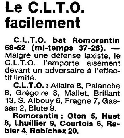 Saison 1986-1987 : Lors de la Journée du 30 Novembre 1986, en Championnat de Régionale Féminine 1, le CLTO bat Romorantin