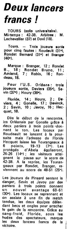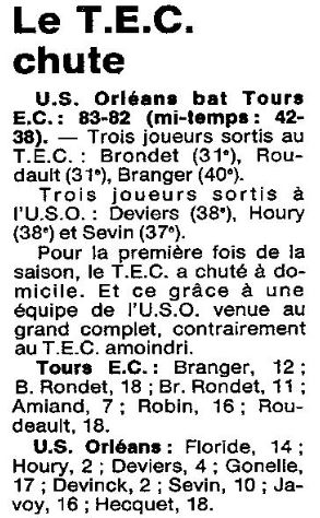 Saison 1986-1987 : Lors de la Journée du 7 Décembre 1986, en Championnat de Régionale Masculine 1, l’US Orléans bat le Tours EC