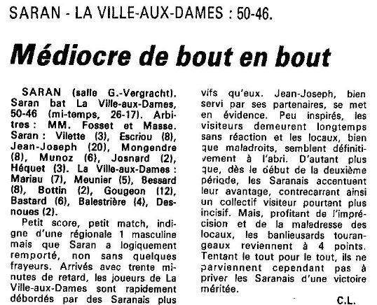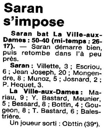 Saison 1986-1987 : Lors de la Journée du 7 Décembre 1986, en Championnat de Régionale Masculine 1, Saran bat La Ville aux Dames