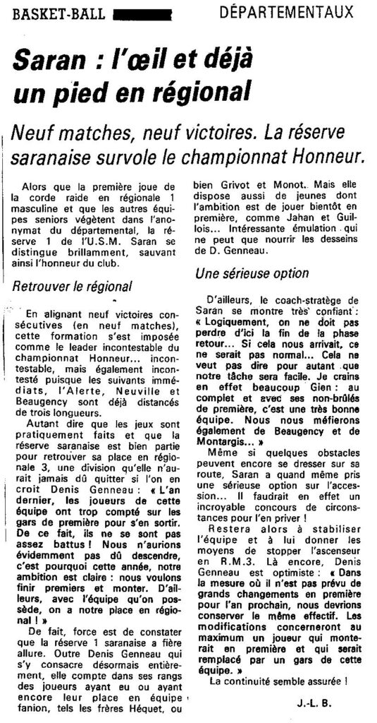 Saison 1986-1987 : En Championnat Départemental du Loiret, la Réserve 1 de Saran survole l’Honneur Masculine