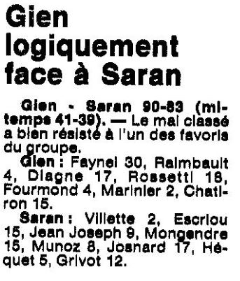 Saison 1986-1987 : Lors de la Journée du 14 Décembre 1986, en Championnat de Régionale Masculine 1, Gien bat Saran