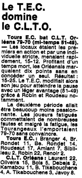 Saison 1986-1987 : Lors de la Journée du 14 Décembre 1986, en Championnat de Régionale Masculine 1, le Tours EC bat le CLTO