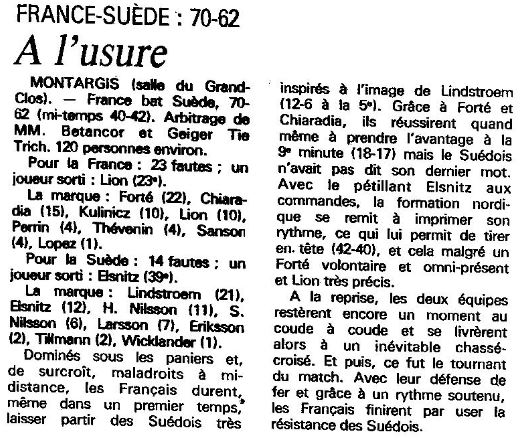 Saison 1986-1987 : Tournoi International Cadets de Montargis. Commentaires sur la Rencontre France-Suède du 27 Décembre 1986