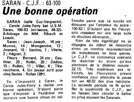 Saison 1986-1987 : Lors de la Journée du 11 Janvier 1987, en Championnat de Régionale Masculine 1, le CJF bat Saran