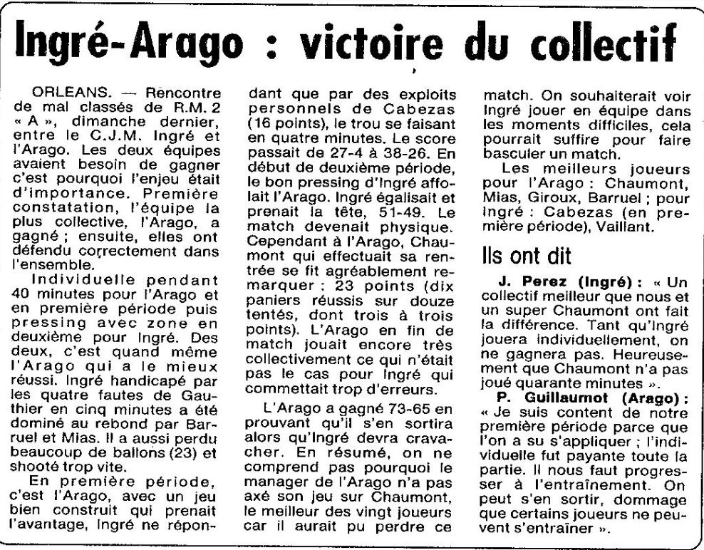 Saison 1986-1987 : Lors de la Journée du 11 Janvier 1987, en Championnat de Régionale Masculine 2, l’Arago bat Ingré