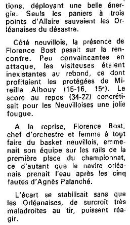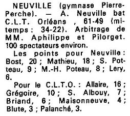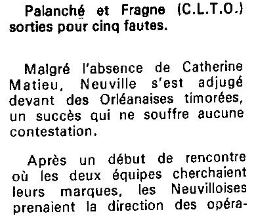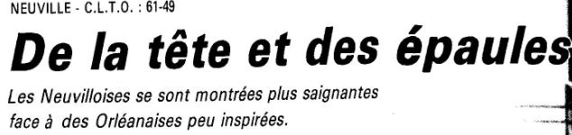 Saison 1986-1987 : Lors de la Journée du 11Janvier 1987, en Championnat de Régionale Féminine 1, Neuville bat le CLTO