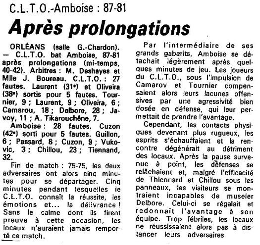 Saison 1986-1987 : Lors de la Journée du 25 Janvier 1987, en Championnat de Régionale Masculine 1, le CLTO bat Amboise