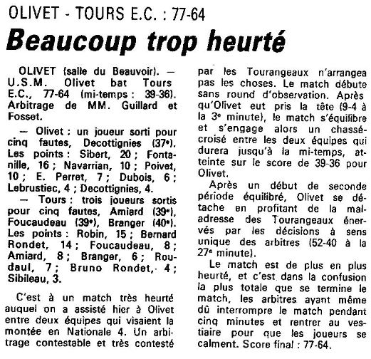 Saison 1986-1987 : Lors de la Journée du 25 Janvier 1987, en Championnat de Régionale Masculine 1, Olivet bat le Tours EC