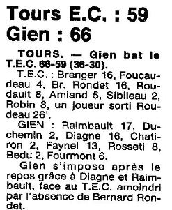 Saison 1986-1987 : Lors de la Journée du 1er Février 1987, en Championnat de Régionale Masculine 1, Gien s’impose face au Tours EC