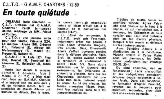 Saison 1986-1987 : Lors de la Journée du 8 Février 1987, en Championnat de Régionale Féminine 1, le CLTO bat GAMF Chartres
