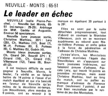 Saison 1986-1987 : Lors de la Journée du 8 Février 1987, en Championnat de Régionale Féminine 1, Neuville bat Monts