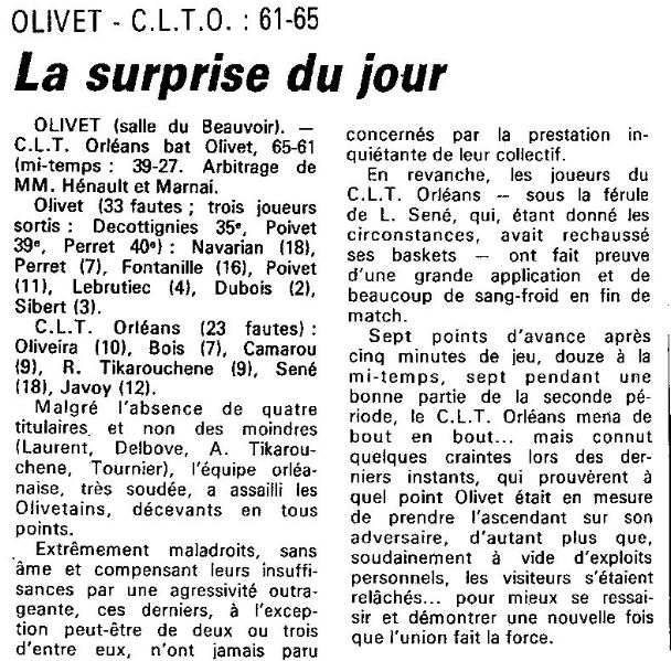 Saison 1986-1987 : Lors de la Journée du 8 Février 1987, en Championnat de Régionale Masculine 1, le CLTO bat Olivet