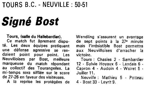 Saison 1986-1987 : Lors de la Journée du 15 Février 1987, en Championnat de Régionale Féminine 1, Neuville bat le Tours BC