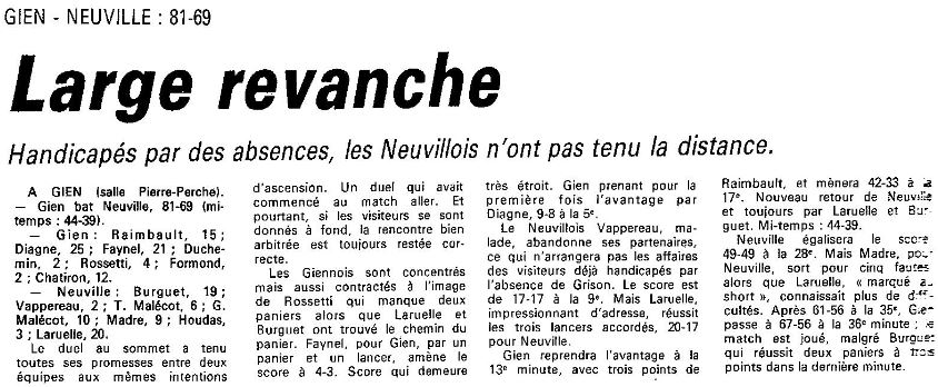 Saison 1986-1987 : Lors de la Journée du 15 Février 1987, en Championnat de Régionale Masculine 1, Gien bat Neuville