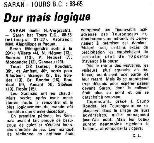 Saison 1986-1987 : Lors de la Journée du 15 Février 1987, en Championnat de Régionale Masculine 1, Saran bat le Tours BC