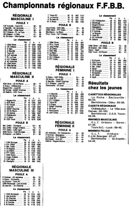 Saison 1986-1987 : Résultats et Classements après la Journée du 22 Février 1987 des Championnats Régionaux