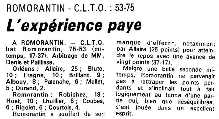 Saison 1986-1987 : Lors de la Journée du 15 Mars 1987, en Championnat de Régionale Féminine 1, le CLTO bat Romorantin