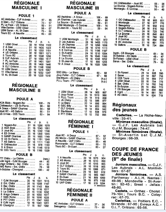 Saison 1986-1987 : Résultats et Classements après la Journée du 15 Mars 1987 des Championnats Régionaux