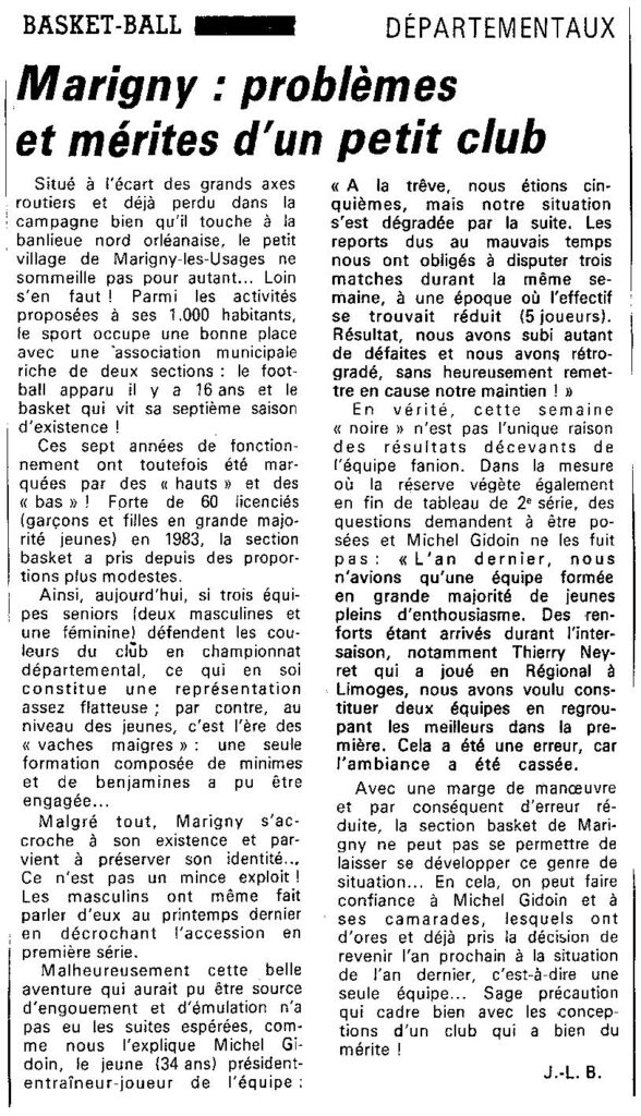 Saison 1986-1987 : Marigny les Usages (45) Commune de 1000 Habitants vit sa 6ème Saison dans la Famille Basket